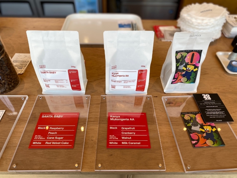 카운터에는 여러 가지 원두도 있었는데요. 메뉴를 확인해 보니 핸드드립을 위한 싱글 원두였습니다. 취향에 맞게 원두를 선택해서 드시면 될 거 같네요.