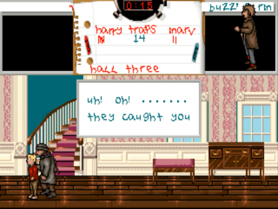 화면 가운데는 트랩의 개수와 점수가 나오고 점수판 좌우에는 해리와 마브가 각각 나오는데 어디에 있는지 위치도 표시가 됩니다. 방에서 함정을 밟으면 넘어지고 점수가 올라갑니다. 그리고 바닥에 있는 함정을 조심해야 하는데 케빈이 밟으면 함정이 없어지기 때문입니다.