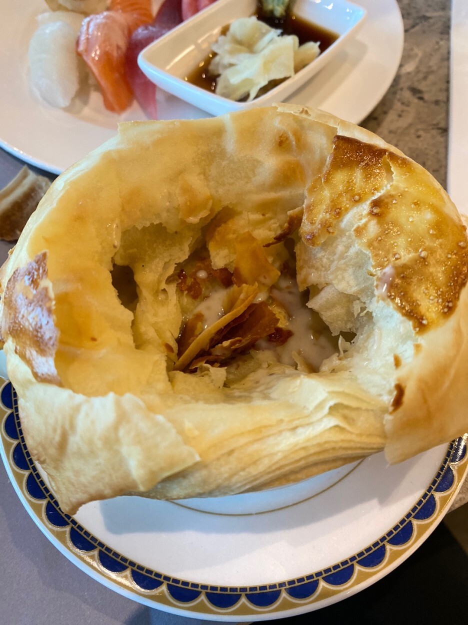버터 전복구이 조금 놀랬어요. 마늘빵 맛이 나서요. 새우 장은 쫀득 짭짤, 봄동 겉절이 너무 맛있었고 김치도 너무 맛있었어요. 게살 수프 맛살 아니고 정말 게살이 들어있긴 하더라고요.