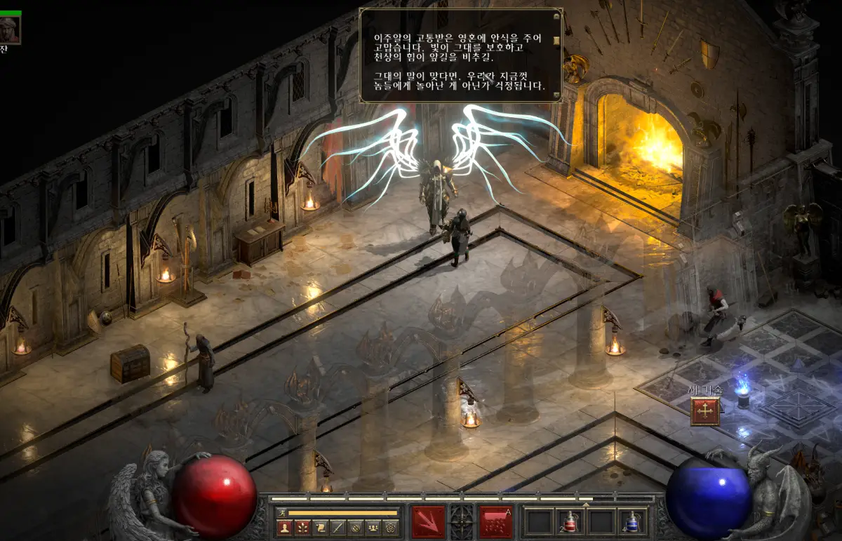 이제 마을로 돌아와 티리엘을 만날 시간입니다. 티리엘은 자신의 친구였던 이주알의 타락에 안타까워하며, 그를 해방해 준 플레이어에게 감사를 표합니다. 그리고 디아블로2 레저렉션 액트4 1 퀘스트의 핵심 보상인 '스킬 포인트 2개'를 즉시 지급해 줍니다.