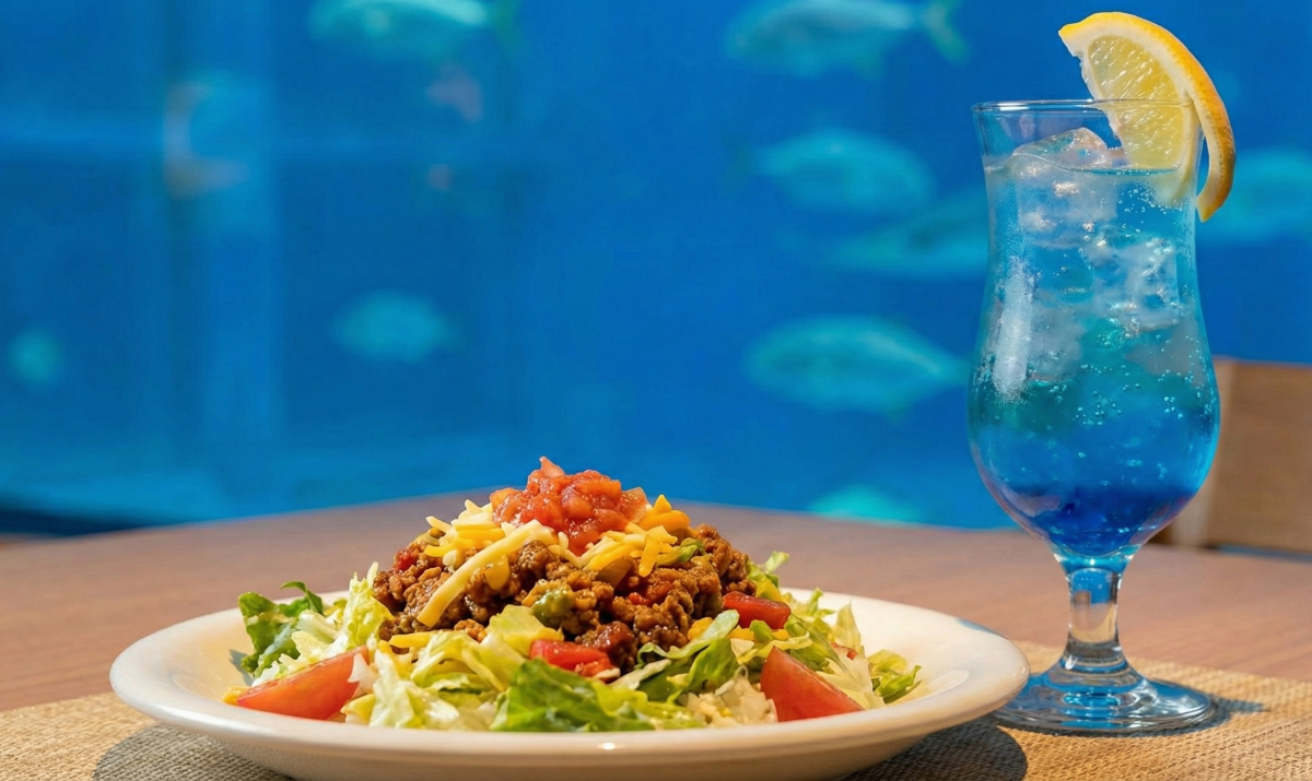 - 시콰사 에이드 & 딥 블루 소다: 오키나와 특산물인 시콰사(히라미 레몬)를 넣은 상큼한 음료나, 수족관의 푸른 빛을 닮은 소다는 사진 소품으로도 제격입니다.
