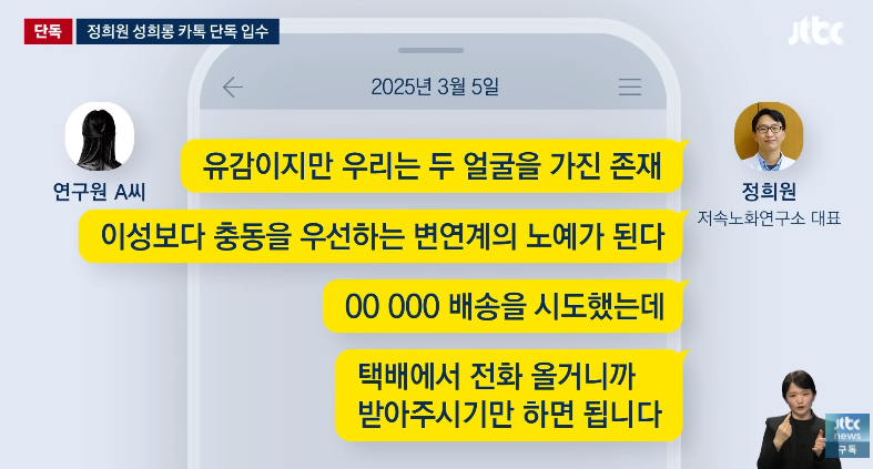 공개된 카카오톡 메시지에서 가장 충격을 준 부분은 성적 취향을 암시하는 단어들이었습니다. 정 교수는 A씨에게 '결박', '주인님', '변연계의 노예' 등의 표현이 담긴 장문의 메시지를 보냈습니다. 또한 특정 도구를 주문했다며 A씨에게 대신 받아달라고 요구하기도 했습니다.