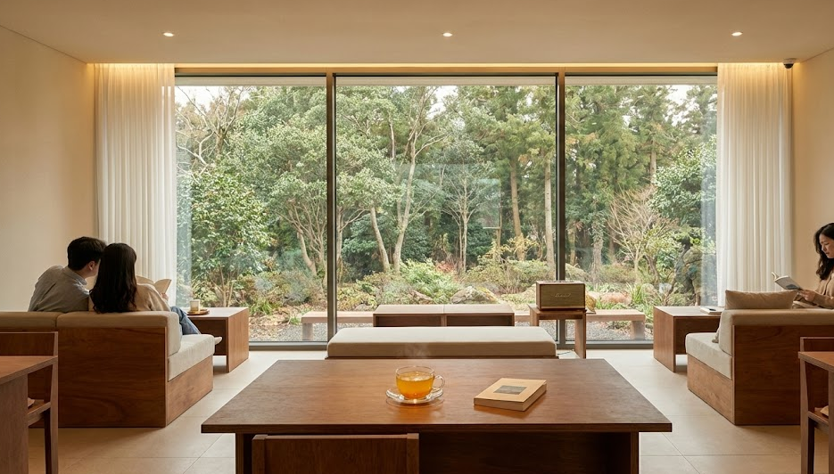 산책을 마치고 나면 정원 끝자락에 위치한 카페 숨도로 향하게 됩니다. 이곳은 단순한 카페를 넘어 정원의 연장선상에 있는 휴식 공간이에요. 커다란 통창을 통해 밖을 내다보면 마치 숲속 한가운데 앉아 있는 듯한 착각을 불러일으킵니다. 따뜻한 우드 톤의 인테리어와 은은한 조명이 마음을 차분하게 가라앉혀 줍니다.