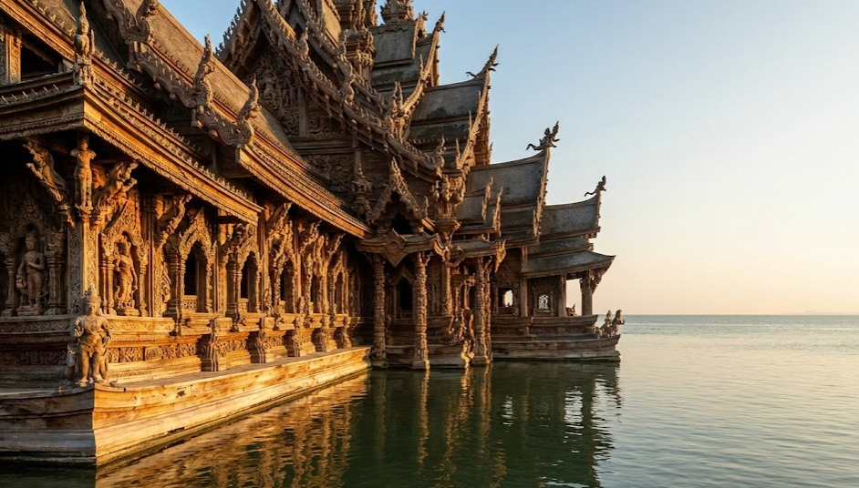 첫 번째로 소개할 곳은 파타야의 랜드마크라고 불리는 진리의 성전(Sanctuary of Truth)입니다. 이곳은 단순한 관광지를 넘어 예술 작품에 가까운 곳이에요. 놀랍게도 못을 하나도 사용하지 않고 오로지 나무만을 깎아 조립하는 전통 방식으로 지어졌다는 사실, 알고 계셨나요? 높이 105m에 달하는 거대한 목조 건축물이 바다를 배경으로 서 있는 모습은 그야말로 압도적입니다.