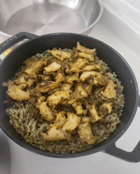 내장이 익어 고소한 향이 올라오면 물기를 뺀 불린 쌀을 넣습니다. 쌀알이 투명해질 때까지 내장과 함께 볶아주세요. 이 과정은 쌀알에 전복의 풍미를 입히는 무쇠솥밥 스타우브 전복솥밥만들기의 핵심 포인트입니다. 쌀알이 서로 달라붙지 않고 코팅되는 느낌이 들 때까지 중불에서 타지 않게 저어주는 것이 중요합니다.
