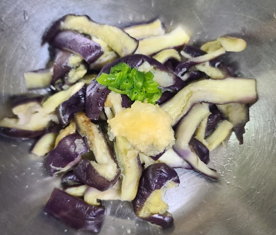 가지가 잘 쪄지고 있어요. 확인하는 방법은 젓가락으로 찔러보면 잘 익은 가지는 잘 들어가지는 반면 덜 익혀진 가지라면 다른 느낌으로 들어갈 거예요.