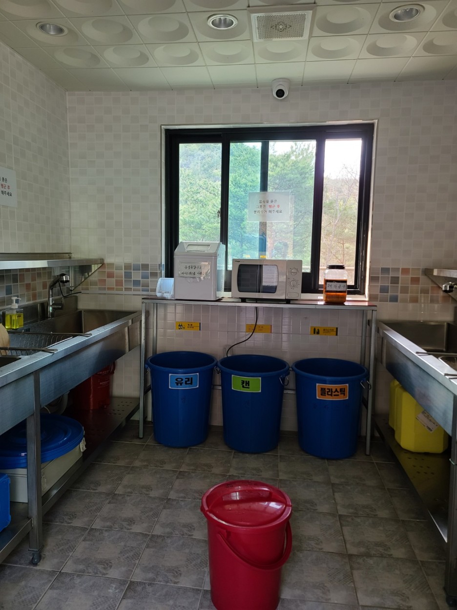 다음은 세척실입니다. 안에는 음식물 쓰레기를 버릴 수 있는 빨간색 바구니와 분리수거를 할 수 있는 파란색 바구니를 세척대와 함께 볼 수가 있습니다.