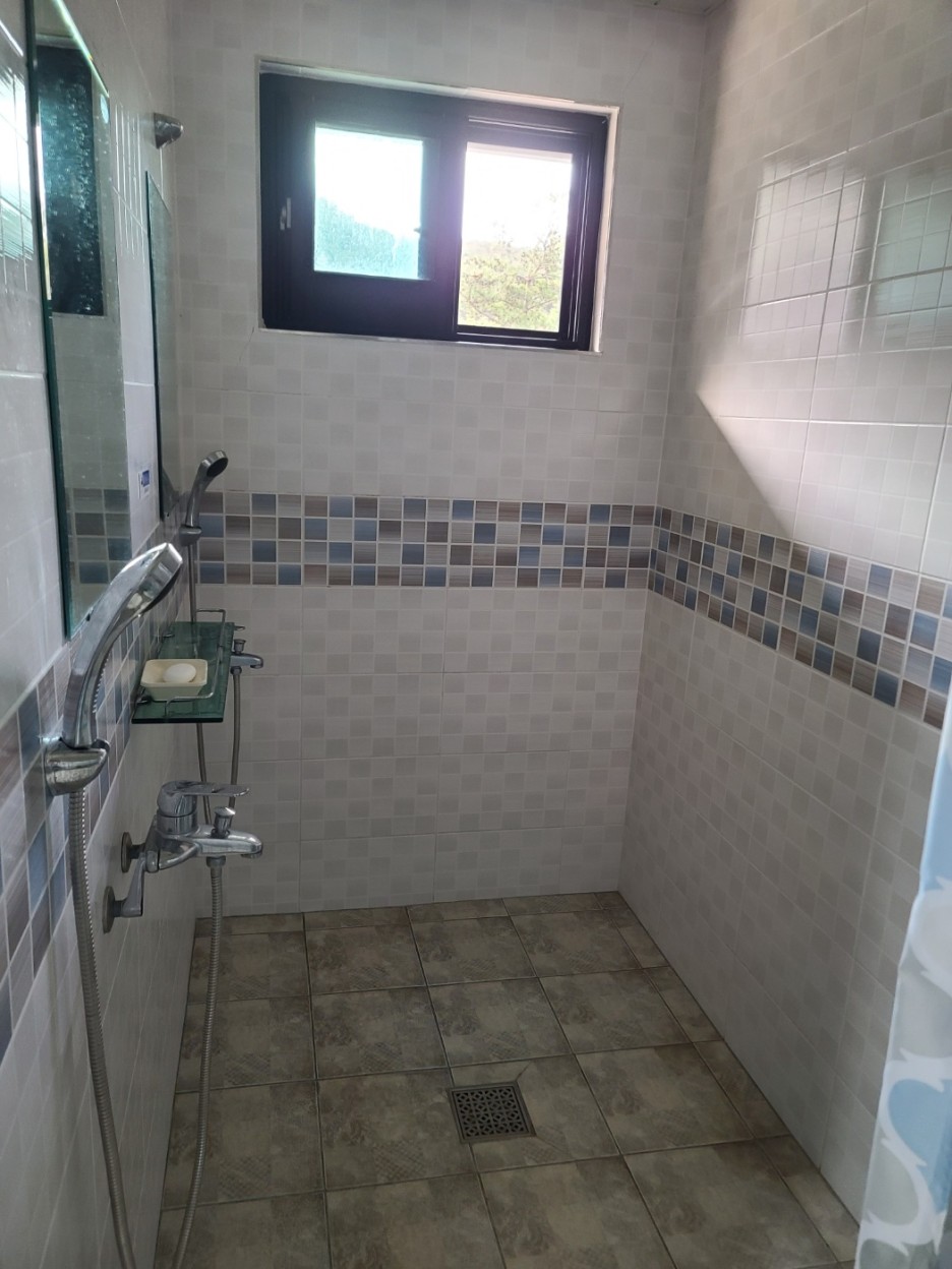 화장실 입구 다른 쪽에는 이렇게 샤워실도 있어요. 샤워실 깨끗하게 청소가 잘 되어있고 가림막도 있어서 편하게 이용할 수가 있어요.