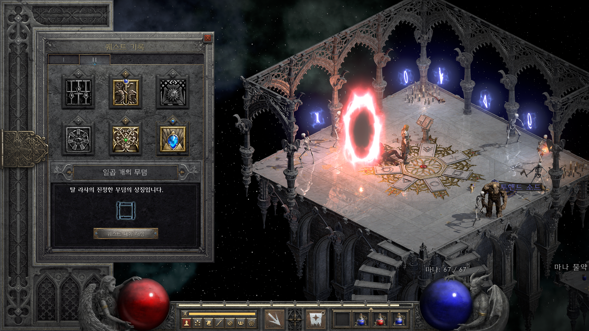 게임에 존재하는 무덤의 기호는 총 7개인데, 허공에 떠 있는 기호는 6개뿐입니다. 즉, 허공에 떠 있는 6개의 기호를 제외하고, 화면에 보이지 않는 단 하나의 빠진 기호가 바로 우리가 찾아야 할 진짜 디아블로2 탈라샤 무덤 위치를 알려주는 표식인 것이죠. 소거법을 활용한 매우 직관적인 퍼즐인 셈입니다. 소환술사를 처치한 직후 붉은 포탈을 타기 전에, 배경에 떠 있는 6개의 문양을 눈으로 훑어보고 어떤 문양이 없는지 파악해 두는 것이 고수들의 팁이에요.