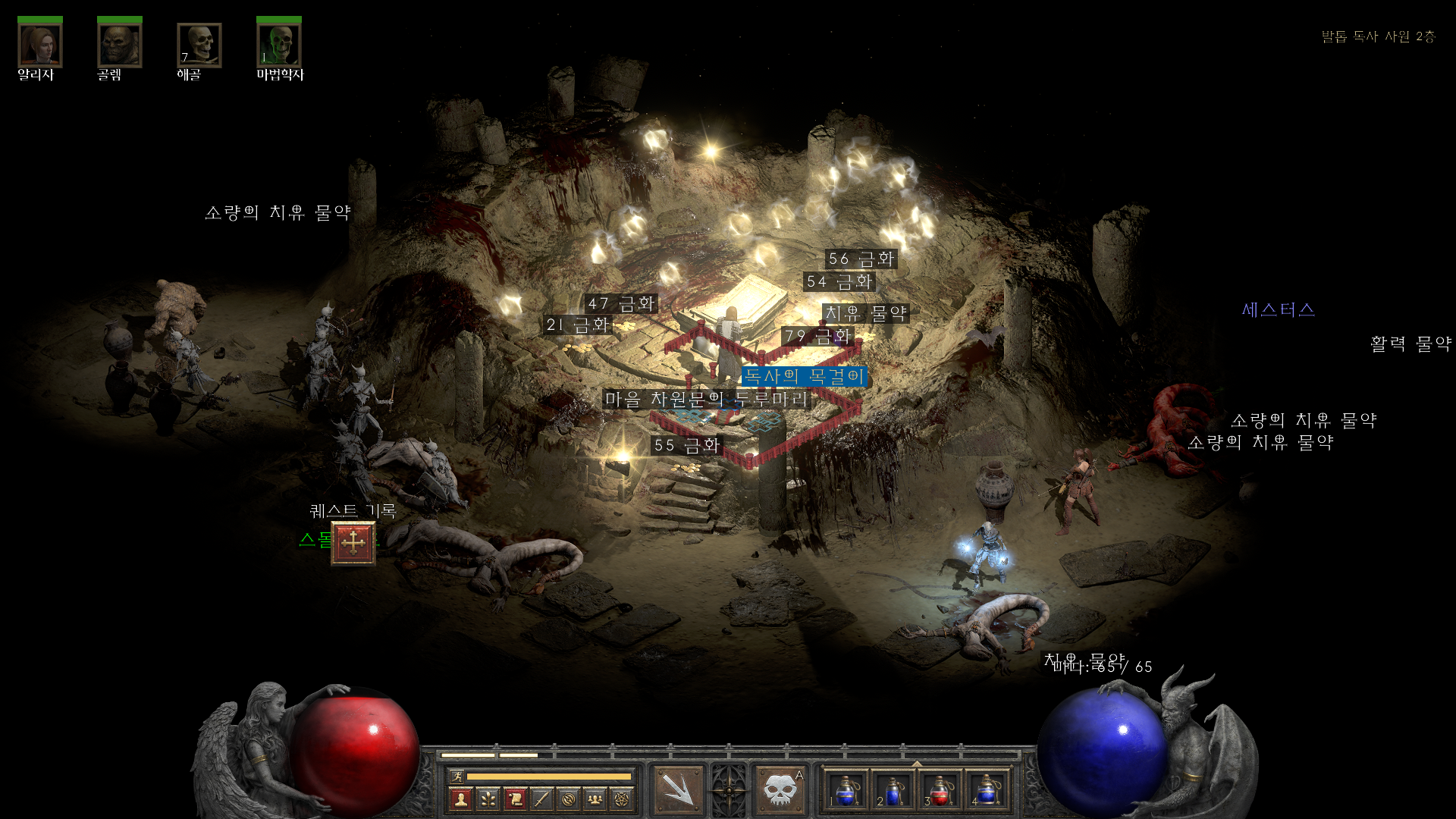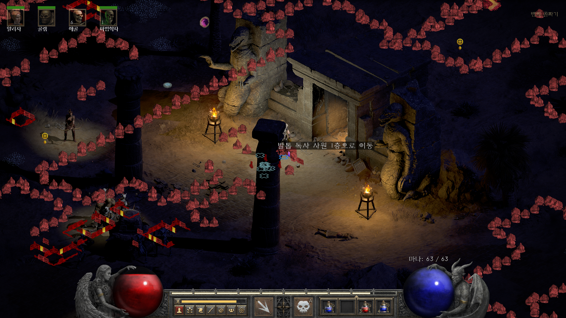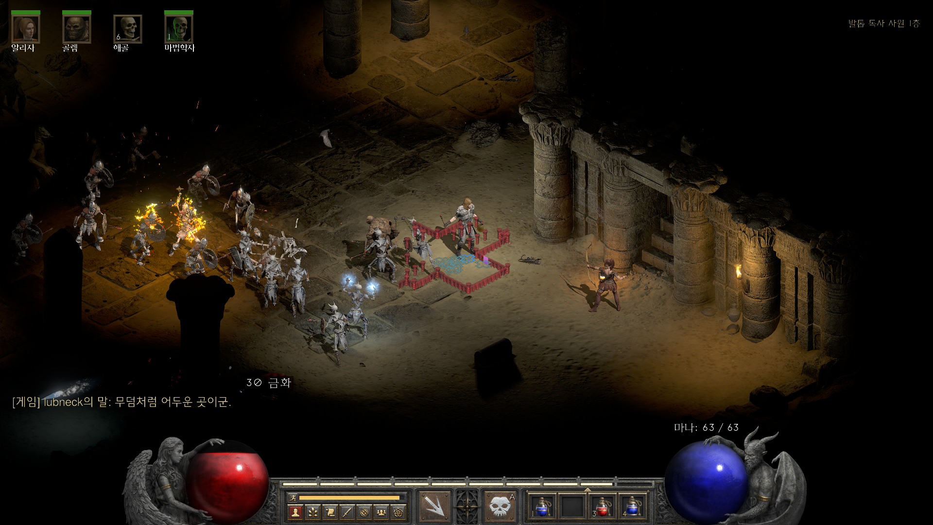 과거 클래식 버전과 달리 디아블로2 레저렉션 그래픽 업데이트 이후로는 던전 내부의 광원 효과가 매우 현실적으로 변했어요. 그 덕분에 사원 내부가 시각적으로 훨씬 어둡고 스산하게 표현되어 몬스터의 기습을 눈치채기 어려워졌죠. 뱀 몬스터들의 뼈 창 공격과 넉백(밀쳐내기) 효과는 캐릭터의 캐스팅을 끊어버리기 때문에 포션 먹을 타이밍을 놓치기 쉬워요.