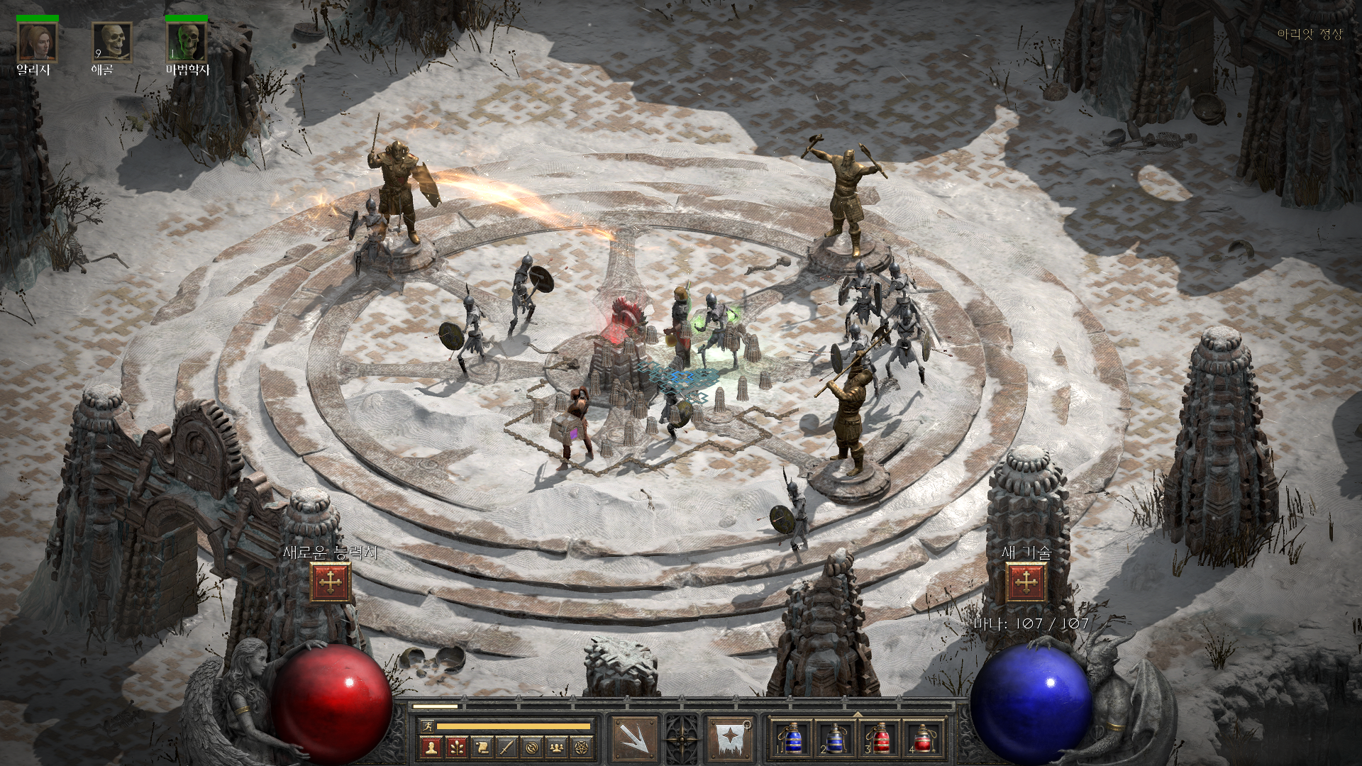 아리앗 정상에 입장하면 '통과 의례' 퀘스트가 시작되며, 세 명의 고대 바바리안 영혼과 전투를 벌이게 됩니다. 전투 중 마을 차원문(포탈)을 열면 퀘스트가 초기화되므로, 전투를 시작하기 전 충분한 물약과 장비를 챙기는 것이 필수적입니다.