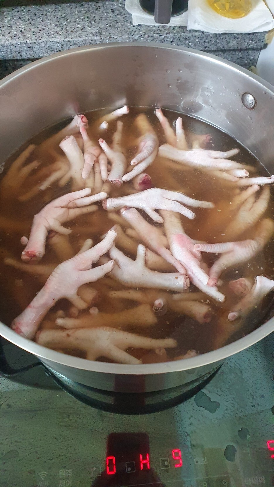 육수를 만들기 위해 닭발이 잠기도록 물을 부어주고 파와 마늘, 생강, 통후추를 넣어주고 30분 정도 삶아주었습니다. 삶고있는 닭발의 반은 양념 닭발을 만들고 나머지 반은 닭발 편육을 할 예정이기 때문에 양념용 닭발은 30분이 지나면 절반 정도를 덜어낼 계획입니다.