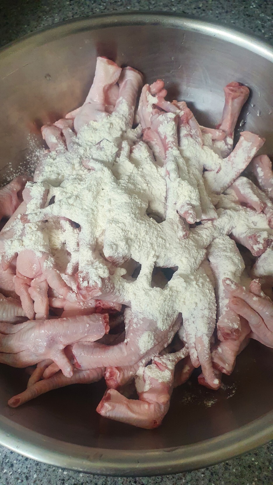살면서 닭발을 만져보게 될 줄은 상상도 못 했습니다. 인터넷이나 유튜브를 보다 보니 만들어보고 싶은 마음이 생겨 어느 날 마음먹고 닭발을 구입하게 되었습니다. 뼈가 제거된 닭발을 구입하려다 저 같은 경우는 맛도 맛이지만 발라먹는 것을 즐기기 때문에 뼈가 있는 제품을 구입하였습니다. 닭발은 냉동으로 2kg를 준비하였습니다. 사용하기 며칠전에 냉동실에서 꺼내어 냉장고에서 천천히 해동을 하였습니다. 제조방법을 찾아보니 닭발은 특유의 잡내를 없애는 게 중요하다고 하더라고요. 그러기 위해선 밀가루로 씻어내는 게 좋다고 해서 마구마구 씻어내주었습니다. 처음 만져보는 생닭발이라 손에서 느껴지는 느낌이 묘하고 이상합니다. 조금 징그럽다고 생각도 되고요. 미리 손질이 된 닭발을 주문 했지만 몇몇 닭발에서 발톱이 보이고 뼈같이 보이는 이물질이 많이 보여 밀가루로 씻어준 후로도 어려번 헹궈주었습니다.