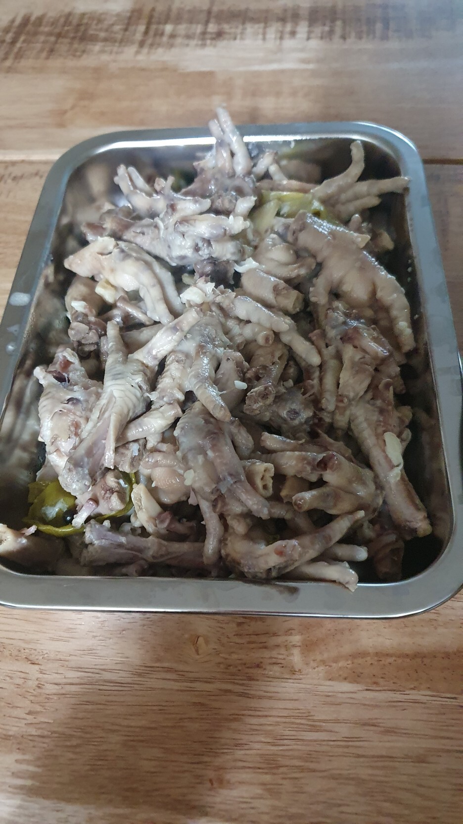 앞에 옮겨놓은 육수에 간을 합니다. 저 같은 경우는 간장과 굴소스, 소금을 넣었습니다. 그리고 밋밋한 맛이 나서 청양고추를 잘라 넣어 주었습니다. 준비한 용기에 닭발을 깔아주고 육수를 부어주어 냉장고에 굳혀주면 끝입니다. 제목에서 보셨듯이 실패라고 했는데 절반의 성공과 절반의 실패를 맛보았습니다. 성공한 부분은 편육이 잘 굳었다는 것 콜라겐이 모자라면 묵이 안 굳는 경우도 있다고 하더라고요. 전 다행히 잘 굳었습니다. 그리고 양념 닭발도 그랬지만 특별하게 잡내나 이상한 맛이 안 나서 다행이었습니다. 그러면 실패한 부분은 일단 맛이 너무 아쉬웠습니다. 간을 조금 약하게 했는데 충분히 강하게 간을 하는 게 맞는 거 같습니다. 맛이 잘 느껴지지 않더라고요. 그리고 청양고추를 넣은 건 나쁘지 않았는데 더 곱게 잘라서 넣어주는 게 먹기가 편할 거 같습니다. 그리고 닭발과 육수의 양도 고려를 해야 하는데 닭발에 비해서 육수가 많으면 굳은 육수만 먹게 돼서 식감이나 맛이 좋지가 않았습니다. 높이 높고 좁은 용기에 닭발을 넣어주고 닭발이 잠길 정도만 육수를 부어주는 게 알맞은 양으로 생각이 됩니다. 두부처럼 뒤에서 눌러줄 수 있으면 더 좋을 거 같고요. 저처럼 아쉬움 남기지 마시고 맛있는 편육 만드시면 좋겠습니다.