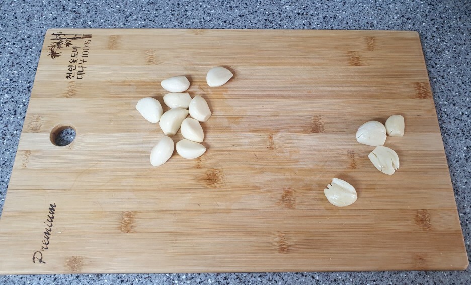 씻어준 등뼈는 잠시 두고 필수 재료인 마늘을 꺼냅니다. 이때 마늘은 편이나 다지는 게 아니라 마늘의 즙이 나올 수 있게 뭉개듯이 눌려서 뭉개줍니다. 갯수는 많을수록 좋다고 합니다. 전 좀 적게 넣은거 같아요.
