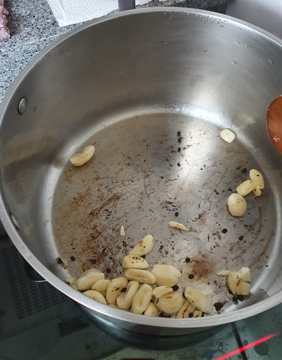그리고 냄비에 물이나 기름을 넣지 않고 준비한 마늘과 통후추를 볶아줍니다. 이런 과정에서 타기 쉽기 때문에 간 마늘이 아닌 통마늘을 써주네요. 마늘이 색이 갈색으로 변하고 바닥에도 눌은 흔적이 생기면 물을 넣어줍니다.