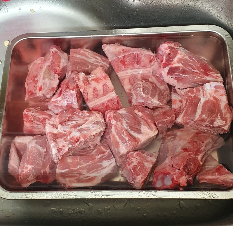 예전부터 돼지등뼈를 이용한 요리를 먹고 싶었는데 감자탕이 대부분이라 조금 아쉬웠습니다. 시간이 지나고 바쿠테라는 음식을 알게 되었고 그것을 응용하여 돼지등뼈탕을 만든다는 것을 알고 바로 등뼈를 주문했습니다. 주문한 등뼈는 국산 한돈 3kg입니다. 국산 등뼈는 살이 많이 안붙어 있다는 이야기를 들어서 조금 걱정했는데 생각보다 살이 좀 많이 붙어있어 기대가 되었습니다. 일단 뼈가 있기 때문에 절단하면서 나오는 파편이나 기타 이물질을 제거하기 위해 흐르는 물에 두어 번 씻어줍니다. 씻어준 뒤 선택지가 2가지가 있습니다. 1. 물에 담가서 핏물을 뺀다. 2. 끓는 물에 대친다. 핏물 뺄 시간을 기다릴 수가 없었기 때문에 2번 선택지를 선택했습니다.